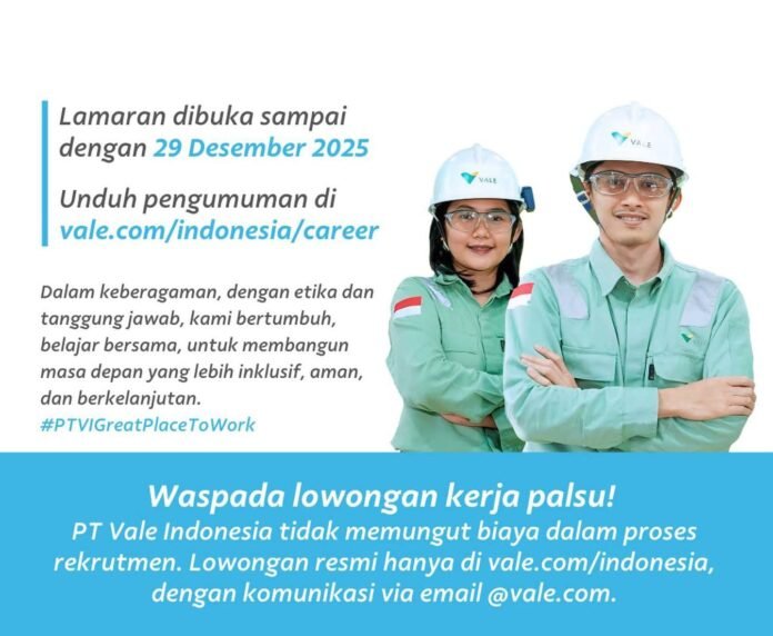 Luwu Timur, batarapos.com – Kesempatan berkarir menjadi bagian dari PT Vale Indonesia kembali dibuka.