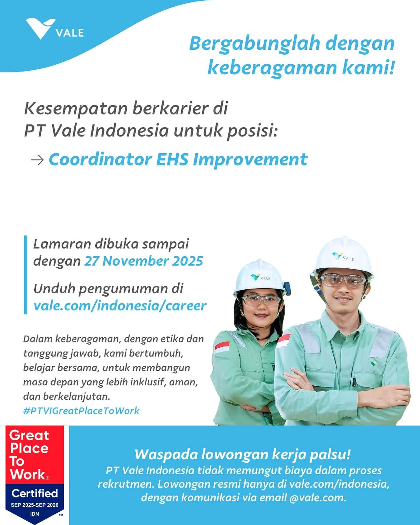 Kali ini, PT Vale Indonesia membuka lowongan kerja untuk posisi Coordinator EHS Improvement.