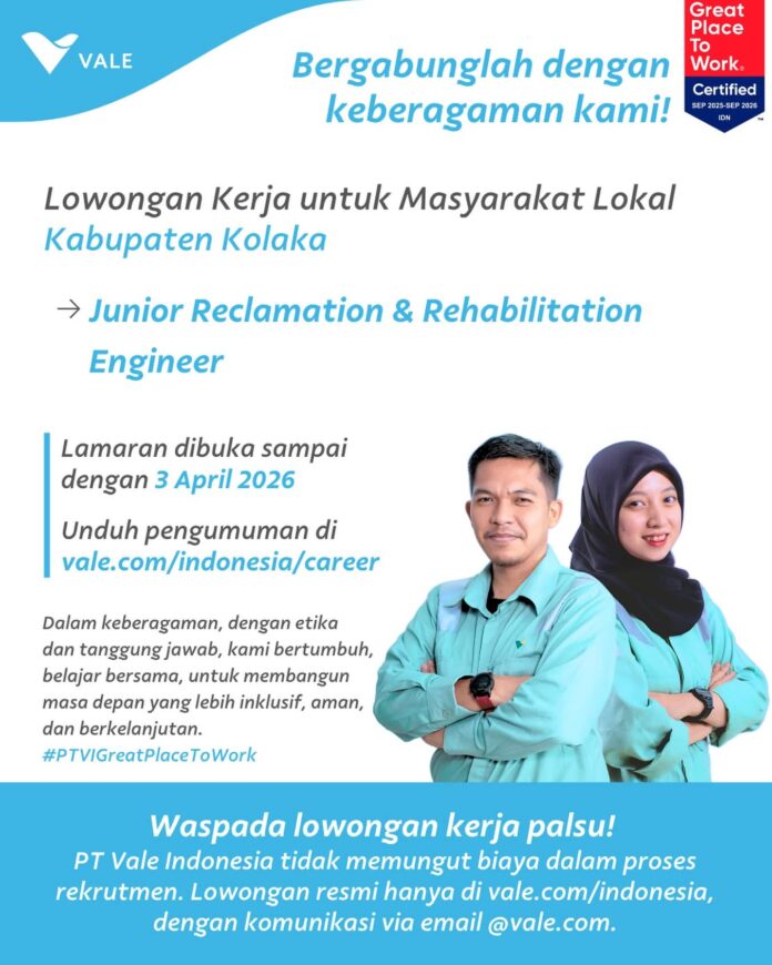 PT Vale Indonesia membuka kembali lowongan kerja untuk posisi Junior Reclamation and Rehabilitation Engineer.