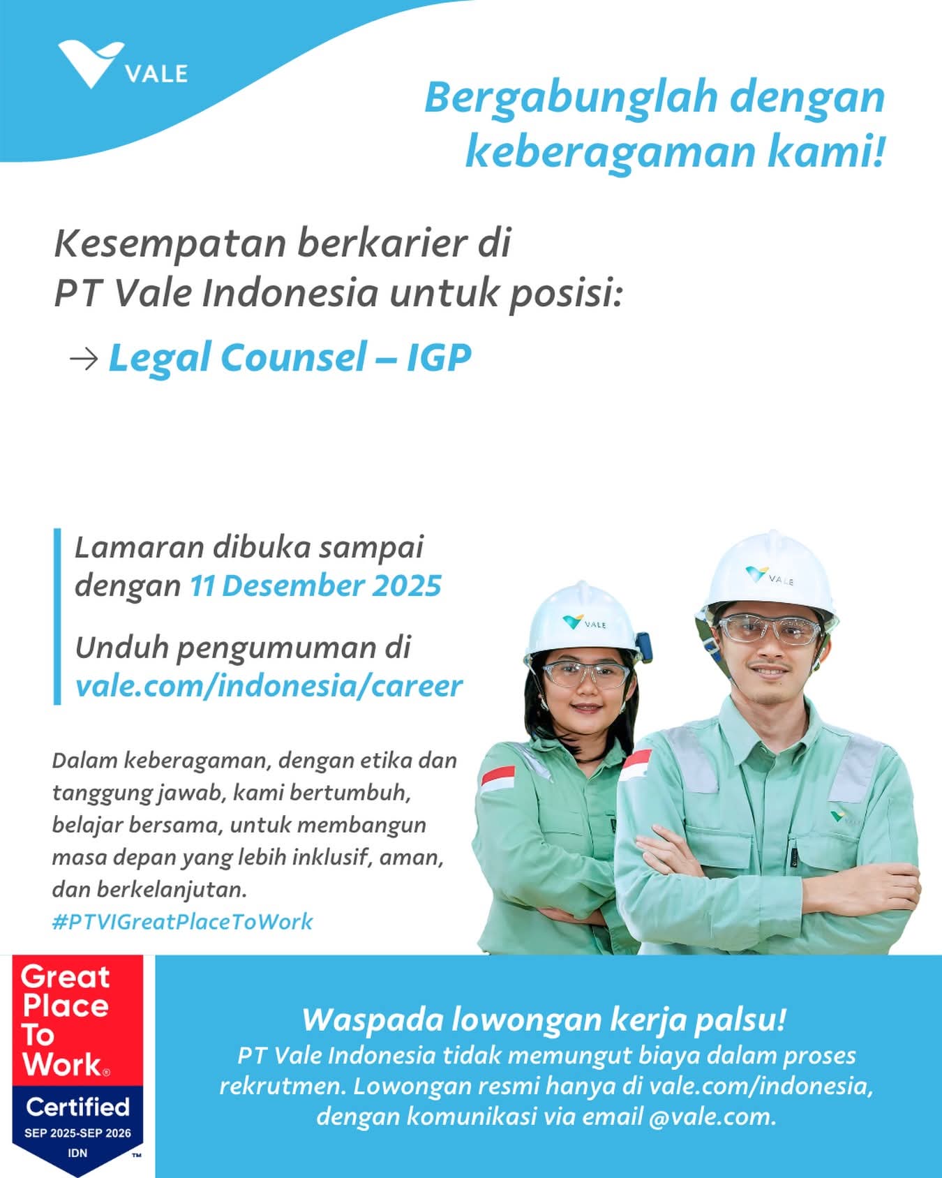 Waspada terhadap penipuan! PT Vale Indonesia tidak memungut biaya apapun selama proses rekrutmen. Informasi lowongan kerja hanya diumumkan melalui situs web dan media sosial resmi PT Vale.
