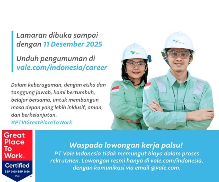 Luwu Timur, batarapos.com – PT Vale Indonesia kembali membuka lowongan kerja untuk masyarakat.