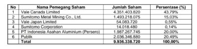 Batarapos.com – PT Vale Indonesia Tbk (“PT Vale”, IDX Ticker: INCO) mengumumkan pada hari ini bahwa, sebagaimana diinformasikan oleh pemegang sahamnya, Vale Canada Limited (“VCL”) dan Sumitomo Metal Mining Co., Ltd. (“SMM”) telah menyelesaikan penjualan dan pengalihan 20% kepemilikan saham di PT Vale melalui Bursa Efek Indonesia, kepada pembeli yang ditunjuk oleh Pemerintah Republik Indonesia yakni PT Indonesia Asahan Aluminium (Persero) (“Inalum”) (“Transaksi”), rabu 7 Oktober 2020.