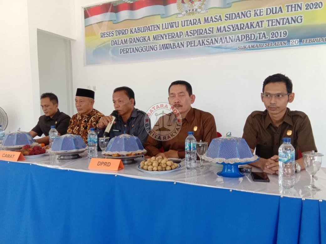 Luwu Utara, batarapos.com – DPRD kabupaten Luwu Utara Daerah pemilihan Dapil II, melaksanakan reses di Aula kantor Kecamatan Sukamaju Selatan. Drs. Edi Sudarto, Wakil Ketua Tim II Reses DPRD Lutra menyampaikan bahwa Reses kali ini adalah untuk menyerap aspirasi terkait kegiatan Tahun Anggaran 2019. Kamis (20/2/2020).