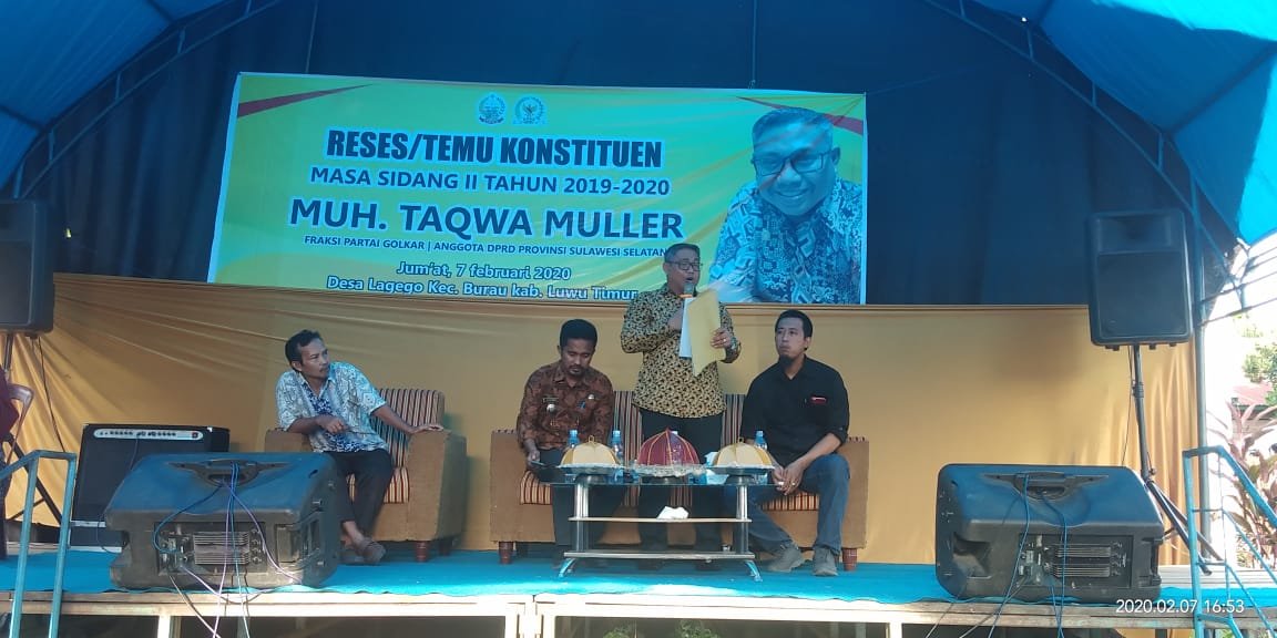 Luwu Timur, batarapos.com – Anggota DPRD Provinsi Sulawesi Selatan, Muh. Taqwa Muller dari Komisi Fraksi pantai golkar wilayah daerah pemilihan Luwu Raya Dapil 11 melaksanakan reses, di desa Lagego, Kecamatan burau, Kabupaten Luwu Timur, Sabtu (7/2/2020).