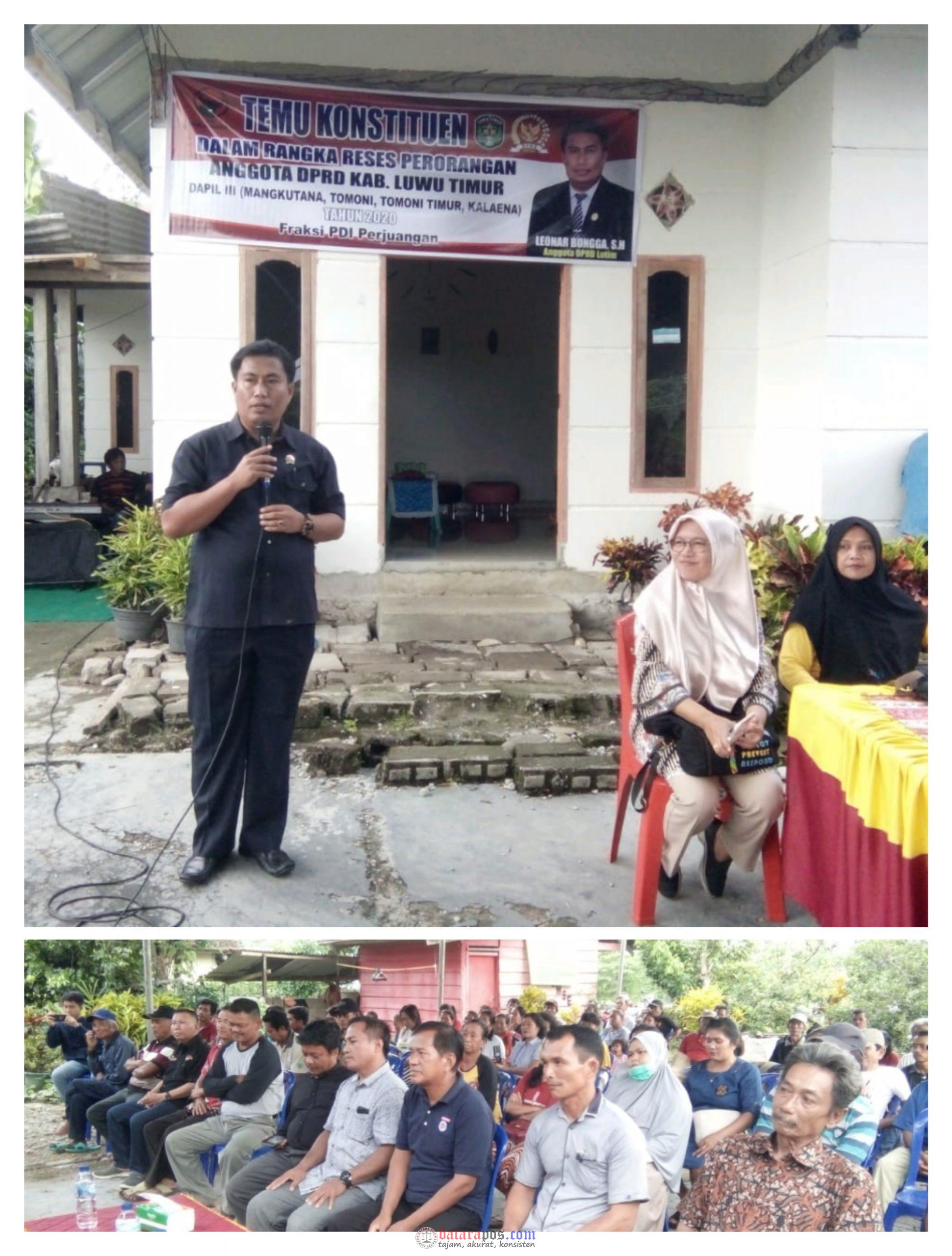 Luwu Timur, batarapos.comĀ – Temu konstituen dalam rangka reses perseorangan Anggota DPRD Luwu Timur masa sidang II Tahun 2020, Leonar Bongga S .H sekaligus sosialisasikan penyebaran Virus Corona, di Desa Teromu, kecamatan Mangkutana, kabupaten Luwu Timur, Jumat (20/3/2020).