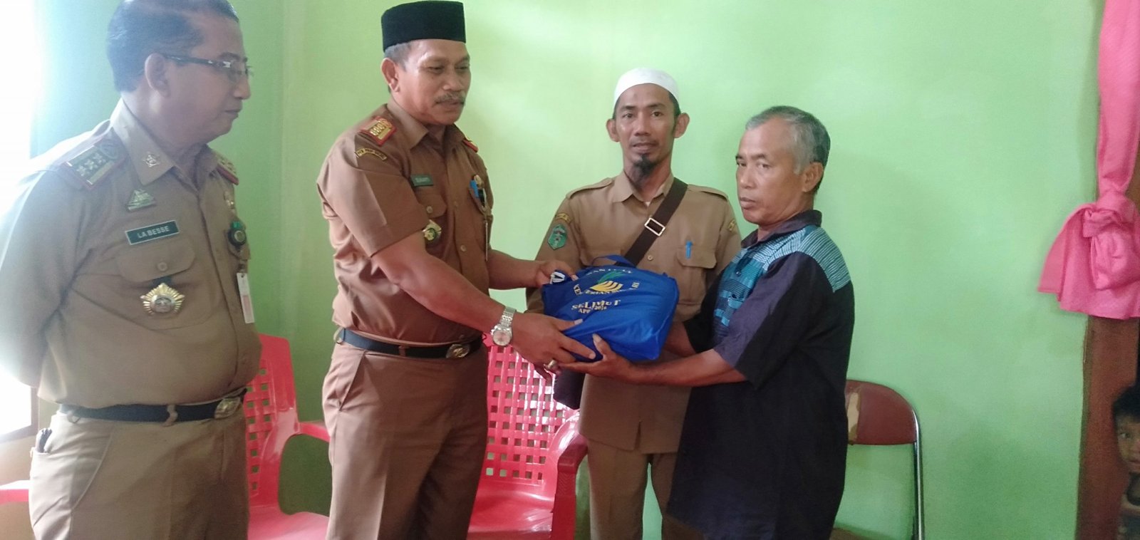 Didampingi Kepala Dinas Pendidikan (Drs. Labesse) dan Kepala Desa Wonorejo Timur (Anwar), Kepala Dinas Sosial (Drs. Sukarti) menyerahkan langsung bantuan tersebut kepada warga yang rumahnya tertimpa pohon Kelapa.