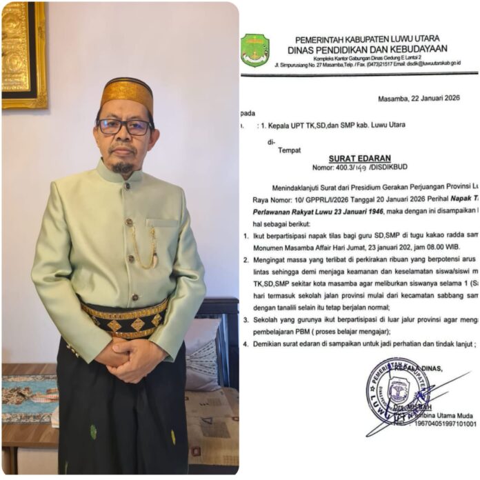 Luwu Utara, batarapos.com – Dinas Pendidikan dan Kebudayaan (Disdikbud) Kabupaten Luwu Utara mengeluarkan surat edaran kepada seluruh kepala UPT TK, SD, dan SMP di wilayahnya untuk berpartisipasi dalam kegiatan Napak Tilas Perlawanan Rakyat Luwu, yang digelar pada Jumat, (23/01/2026).