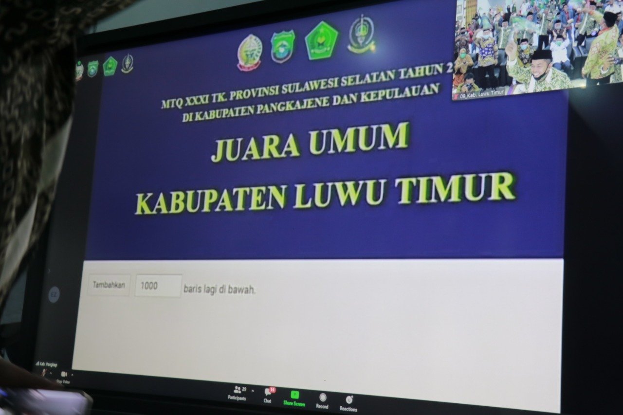 MTQ XXXI secara virtual tingkat Sulsel Tahun 2020 di Kabupaten Pangkajene dan Kepulauan tersebut resmi ditutup oleh Wakil Gubernur Sulawesi Selatan, Andi Sudirman Sulaiman. Khusus di Kabupaten Luwu Timur, penutupan tersebut diikuti oleh Bupati Luwu Timur, H. Muhammad Thoriq Husler didampingi Ketua LPTQ Lutim, H, Amran Syam, Sekda, H. Bahri Suli, kepala OPD lingkup Pemkan Lutim, dan para peserta MTQ Kabupaten Luwu Timur.