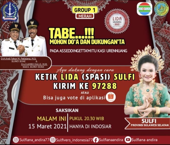 Untuk itu mari kita memberikan dukungan kepada Sulfi dengan cara Katik LIDA (spasi) SULFI kirim Ke 97288 atau Vote di Shopee, Bone Massedi.(Yusri)