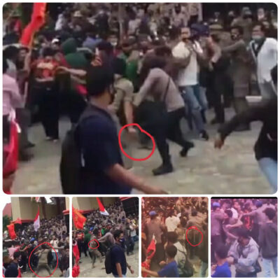 Sambil mengayungkan ke arah para kerumunan demonstrasi, dalam video itu juga sangat terlihat jelas salah satu aparat dari kepolisian spontan berlari kearah sosok satpol PP tersebut, dan mencoba mengambil tongkat yang digenggamnya.